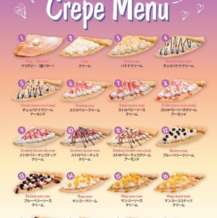 クリスピー(塩バター) ¥500、クリーム ¥500、バナナクリーム ¥550、チョコバナナクリーム ¥600、チョコバナナクリームアーモンド ¥650、ストロベリークリーム ¥550、ストロベリーソースクリーム ¥600、ストロベリーソースクリームアーモンド ¥650、ストロベリーチョコチップクリーム ¥600、ストロベリーチョコクリーム ¥600